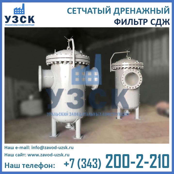На формирование цены дренажного фильтра влияют следующие факторы: материальное исполнение, конструктивное исполнение, стоимость сырья в момент изготовления, комплектация, необходимость доставки в другой населенный пункт, срочность выполнения работ по изготовлению, прочие предпочтения заказчика. Уральский завод стальных конструкций изготавливает фильтры СДЖ-700 любого типового исполнения, а также нестандартные фильтры СДЖ 700 мм по чертежам заказчика или техническому заданию. Дополнительно к фильтрам СДЖ у нас Вы можете заказать сменные фильтрующие элементы любой тонкости фильтрации, ответные фланцы, прокладки и крепеж. По запросу изготавливаем также фильтры СДЖ-К-700 с концевым затвором. Для того чтобы узнать какова цена на фильтр СДЖ Ду700 в Тольятти с необходимыми Вам характеристиками, отправьте запрос в отдел продаж завода УЗСК по координатам, указанным в разделе «Контакты».